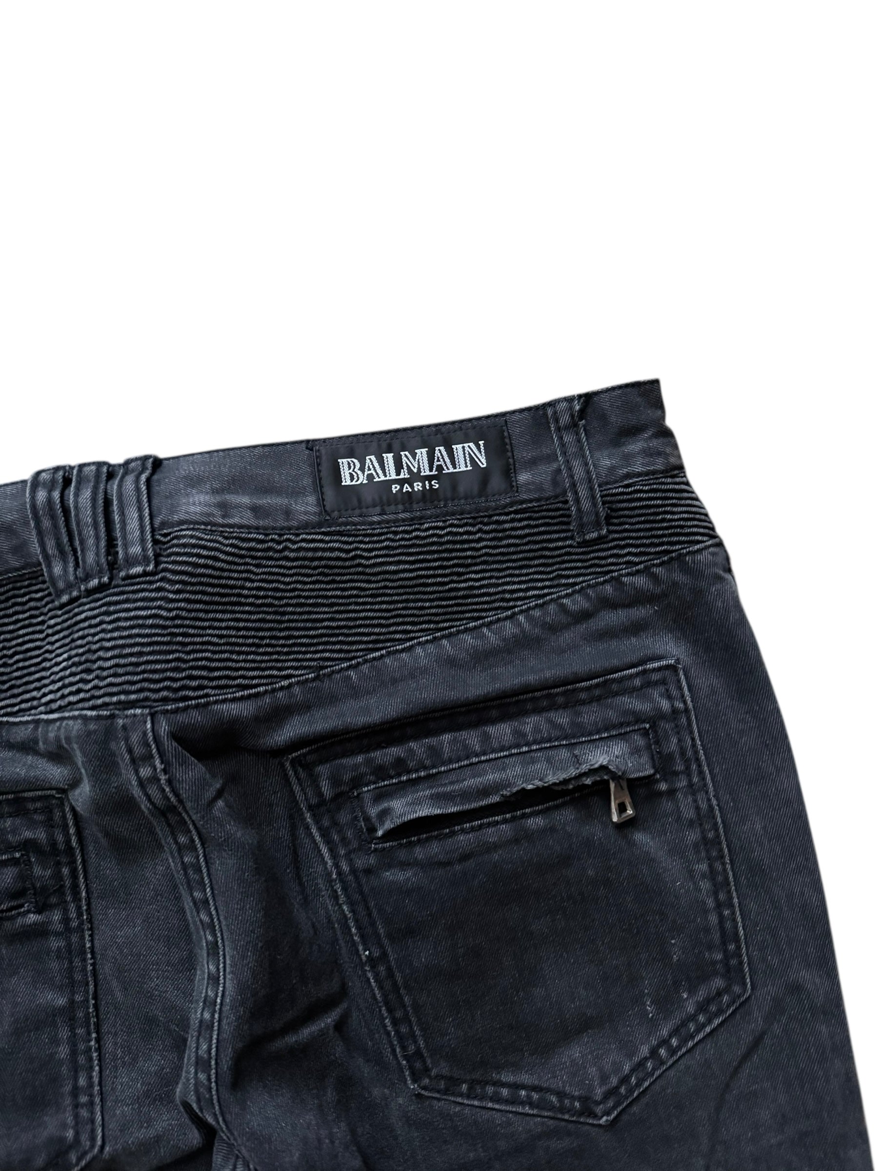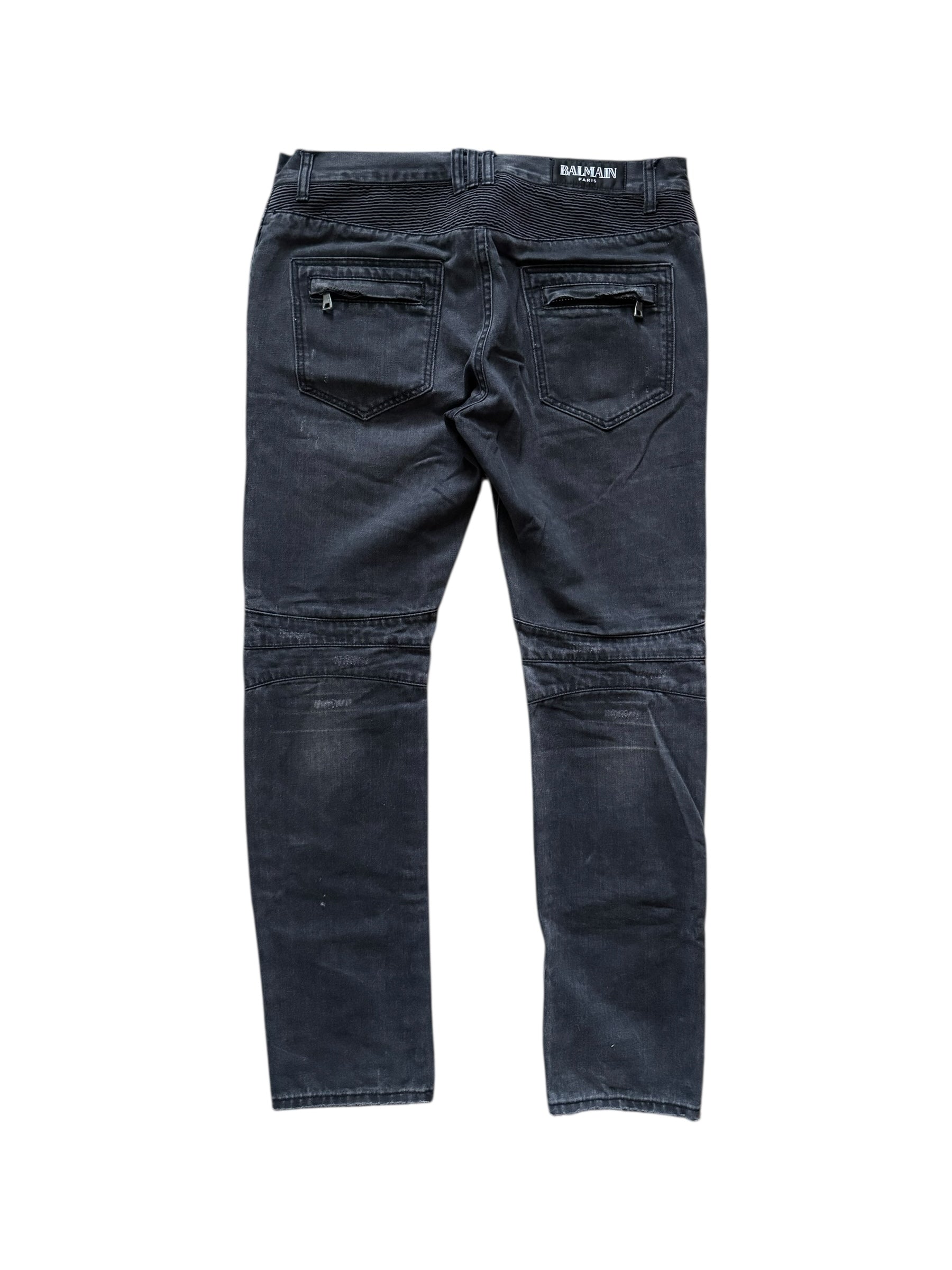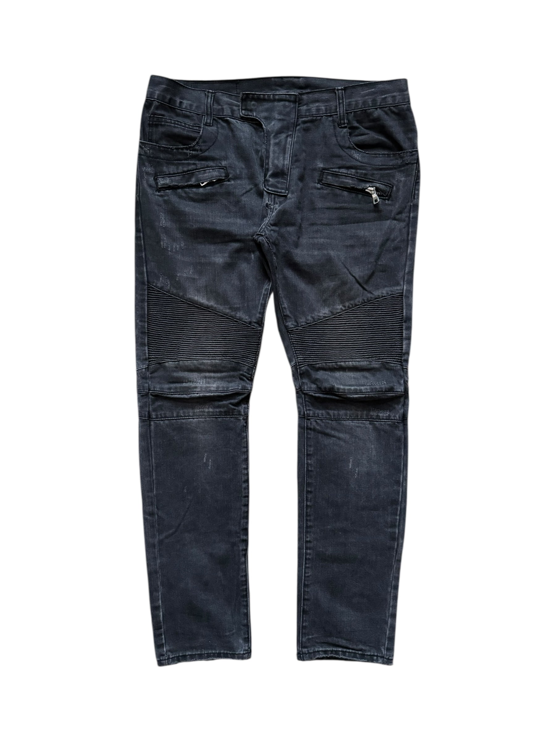 really nice washed & distressed pair of balmain biker denim. Features knee patches and zipper pockets. Good balmain.