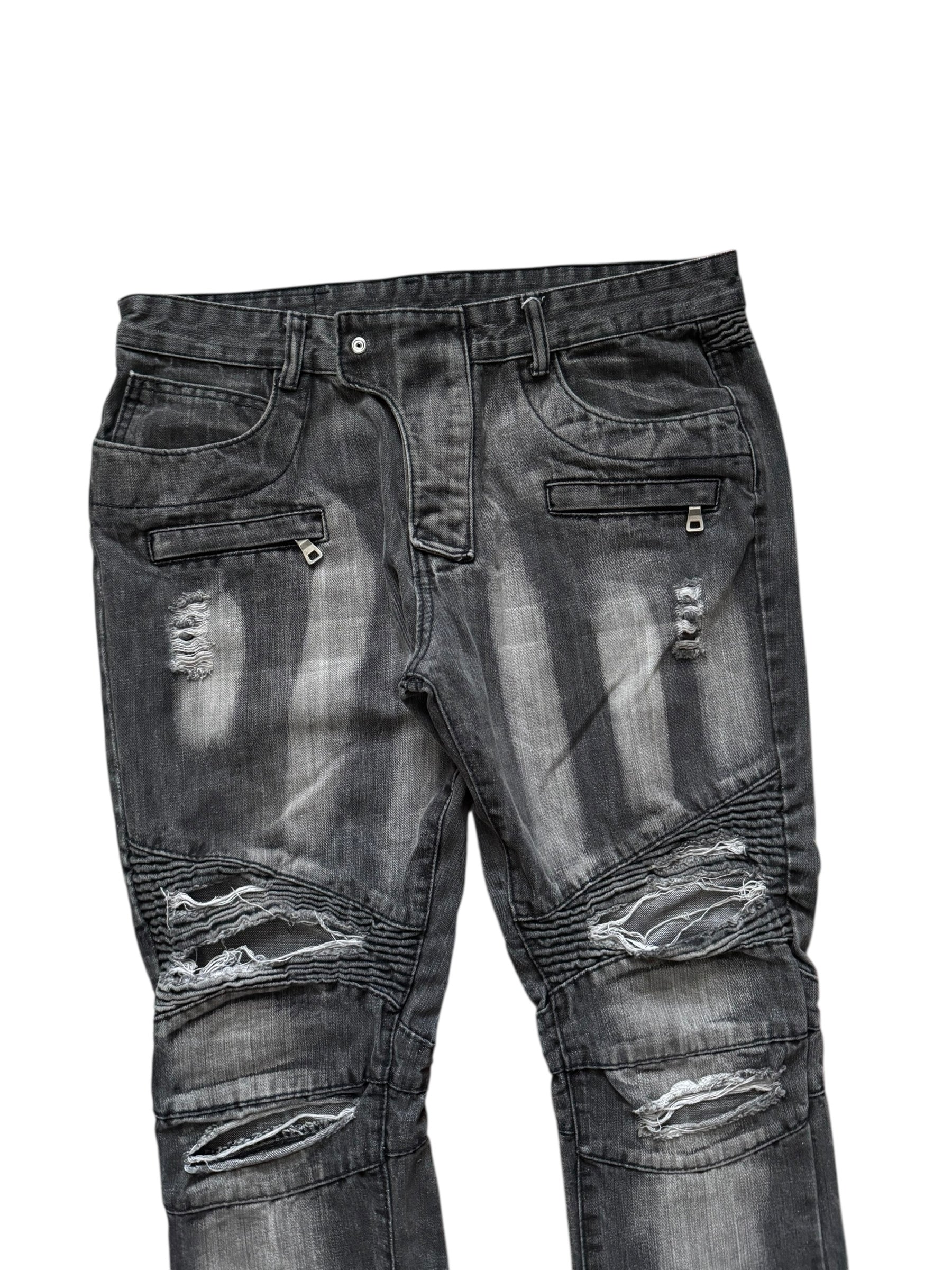 really nice washed & distressed pair of balmain biker denim. Features knee patches and zipper pockets. Good balmain.
