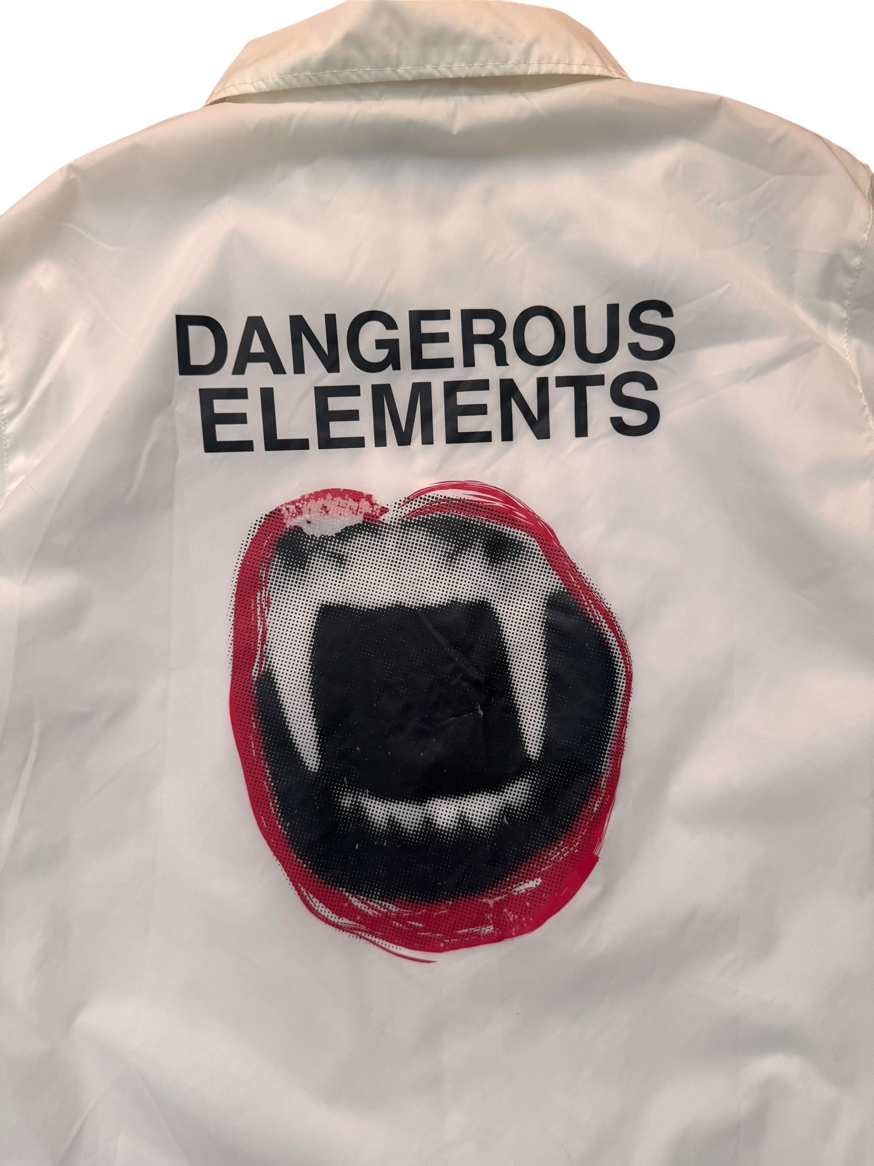 great calm jacket, (much more white in person it’s my lighting) comes in various colors this one is white, features a vampire fang graphic on back with the seasons title “Dangerous Elements” great comfy nylon piece, versatile fit.