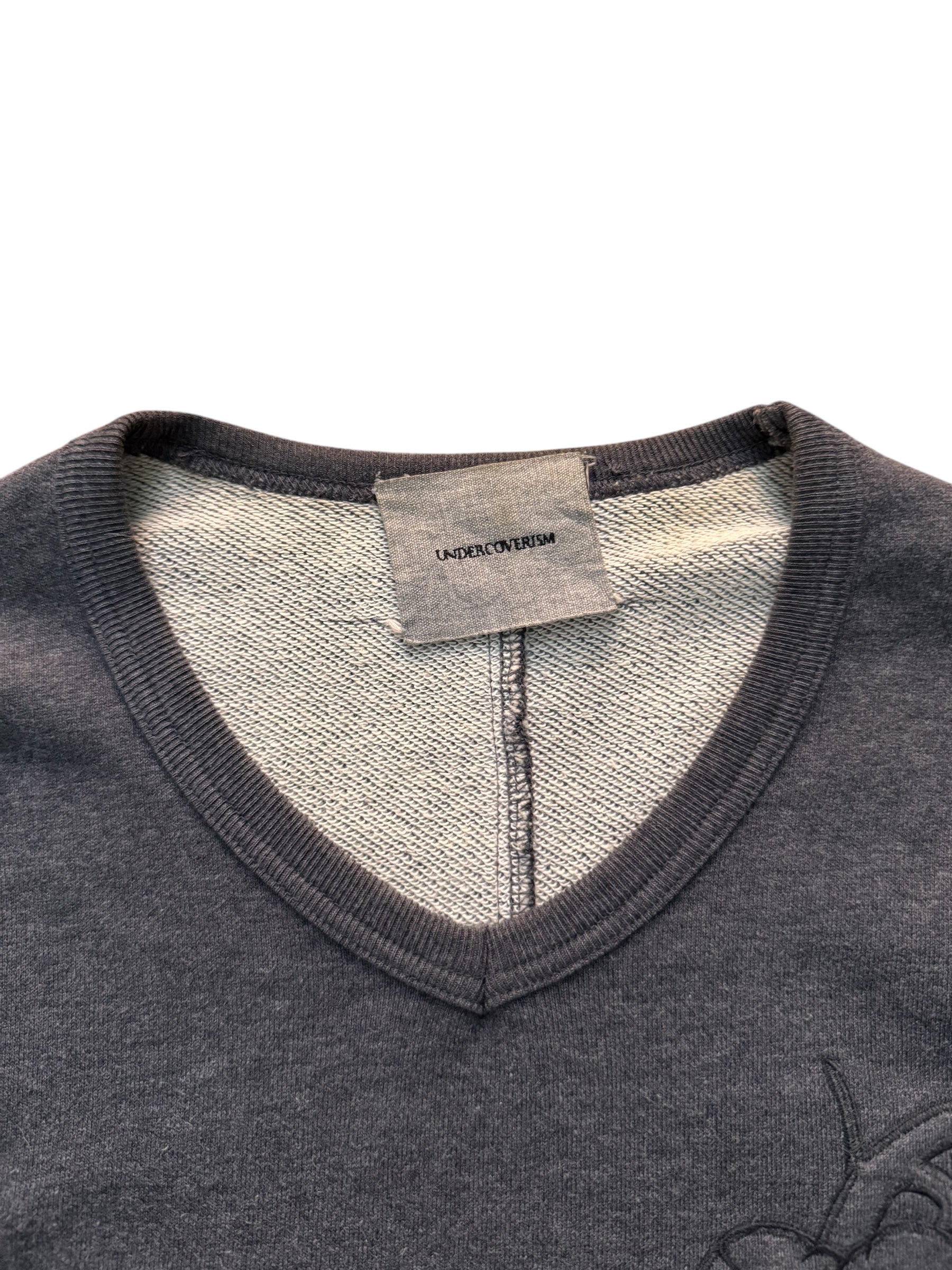 unique and rare undercover top, featuring a symbolically shaped heart patch and v neck. cut & sew design methods. Great piece delving into the idea we are more than just flesh and bone, but complex, emotional, spiritual beings.